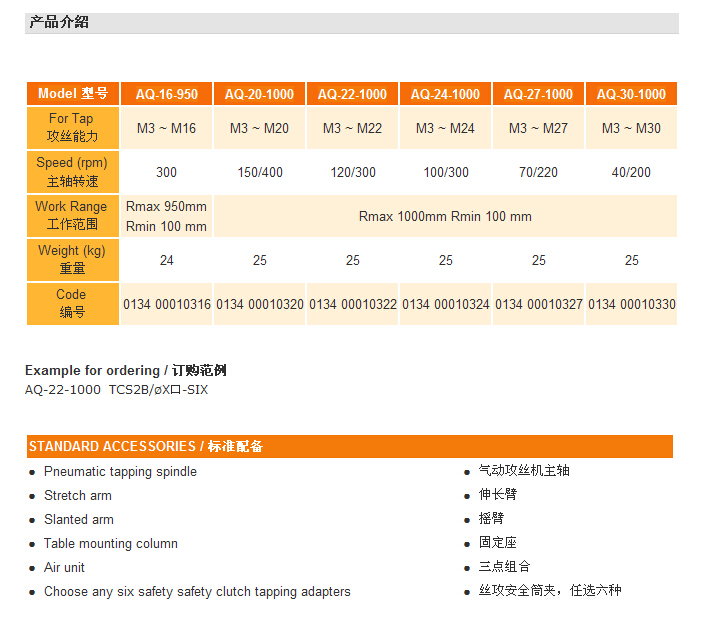 工作半径:1000mm。工作气压:5-8kg。工作要求:洛氏硬度小于45摄氏度的任意金属材料。工作方向:垂直材料表面攻牙或选装万向攻丝装置任意角度攻牙。